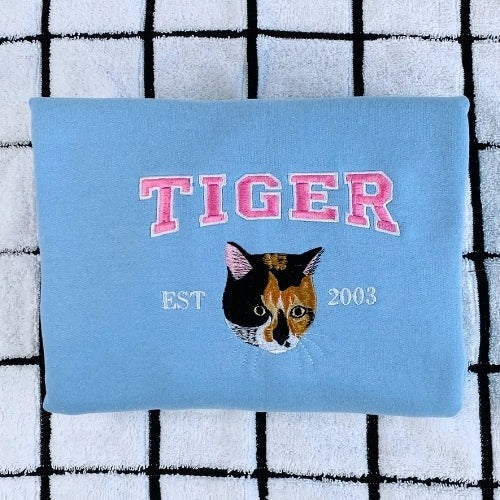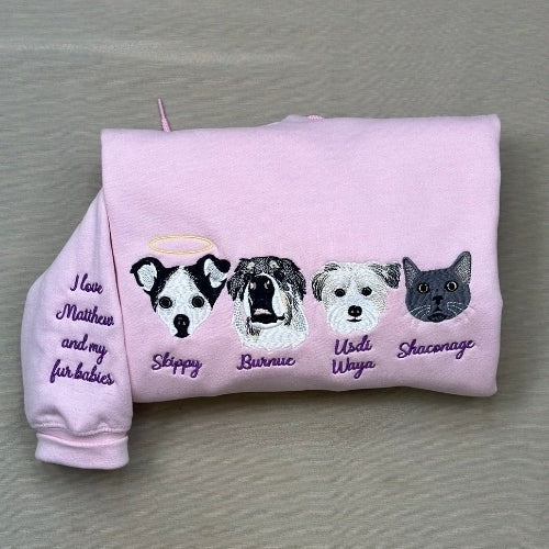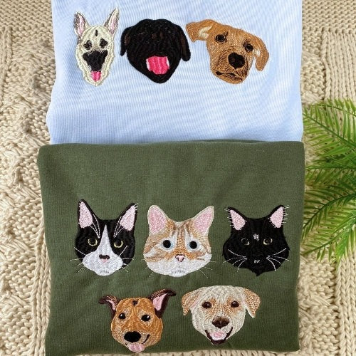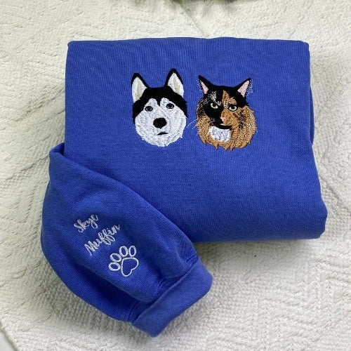 At Couple Hoodies, we specialize in personalized embroidered Pet Portrait t-shirts that bring your furry friend to life — stitch by stitch. Simply upload your favorite photo, and our artists will hand-draw and embroider a one-of-a-kind design that captures your pet’s unique personality.