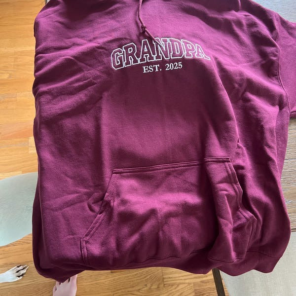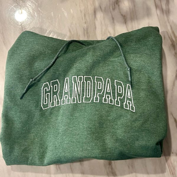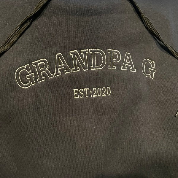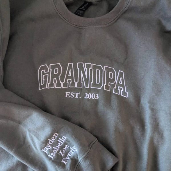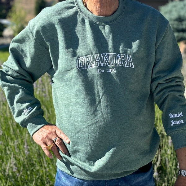 Celebrate the amazing grandpa in your life with this personalized 'GRANDPA EST.' embroidered sweatshirt! Featuring elegant custom embroidery with his grandchild's name lovingly displayed on the sleeve, this high-quality sweatshirt lets grandpa proudly showcase his precious grandchild wherever he goes. Perfect for Father's Day gifts, birthday presents, or celebrating new grandchildren. The thoughtful design combines comfort with sentiment, making it ideal for everything from family gatherings to casual outings. Premium soft fabric with professional embroidery makes this a treasured keepsake he'll wear with pride while making memories with his grandchild.