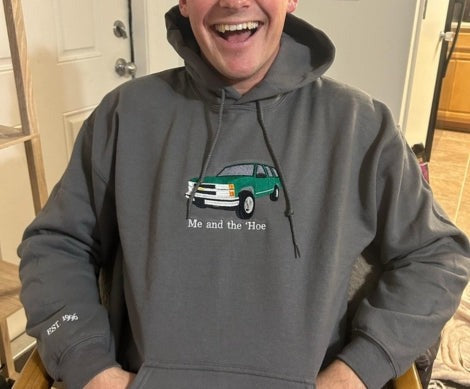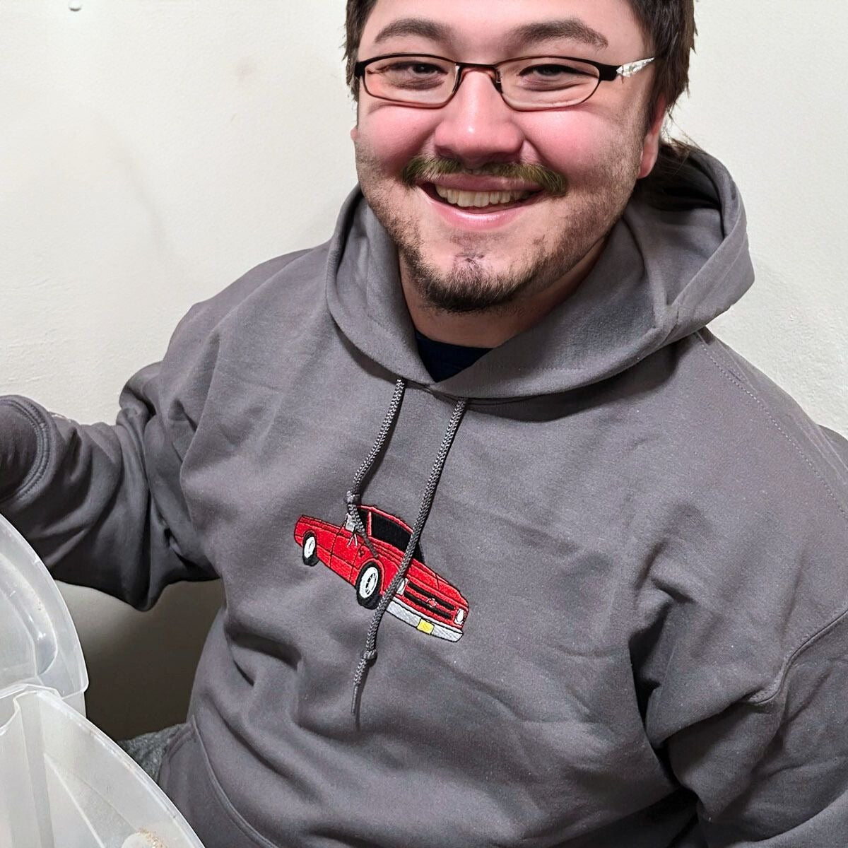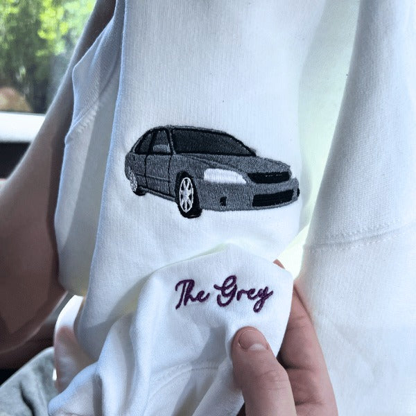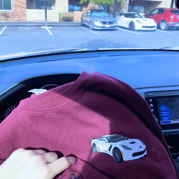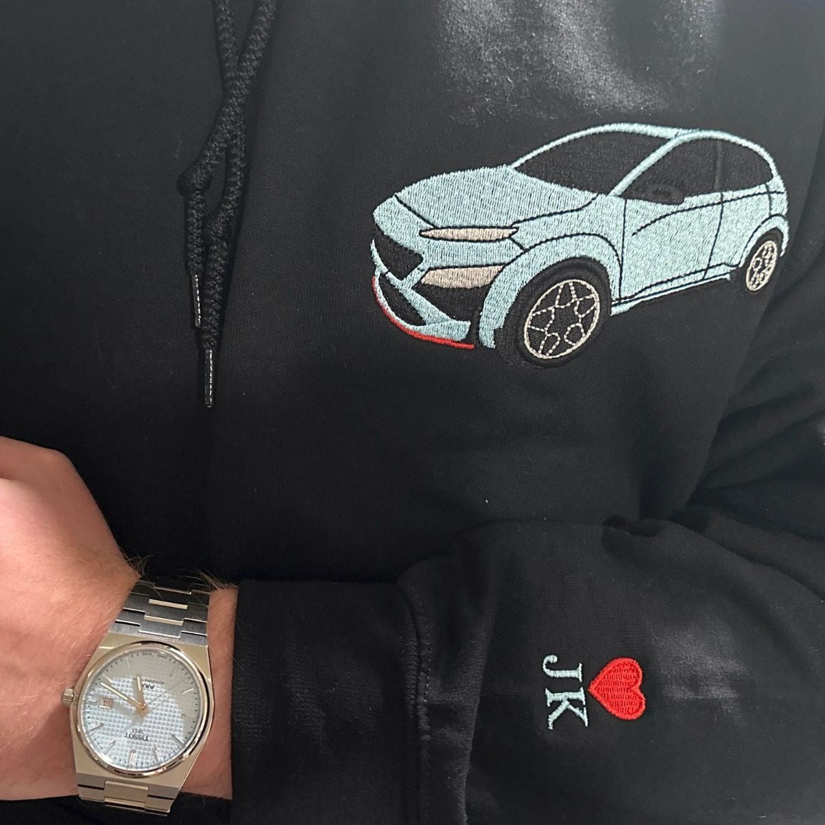 Custom full-color embroidered hoodies from your car photo — soft fleece, true-to-size fit, made to order for car enthusiasts.