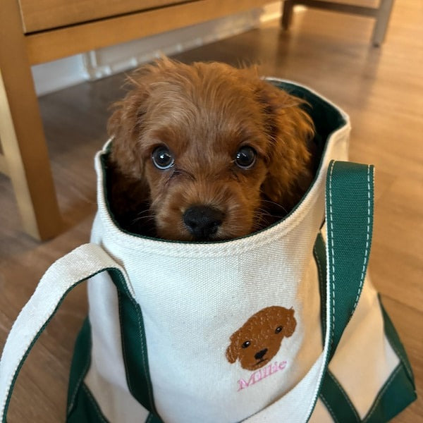 Premium custom doodle portrait tote bags featuring your beloved pup's face and name beautifully embroidered on high-quality canvas. Upload your doodle's photo and we'll create a stunning embroidered likeness capturing their fluffy coat texture and sweet expression. Perfect for goldendoodle, labradoodle, and poodle mix parents who want to carry their precious pup everywhere. High-quality canvas construction with reinforced handles ideal for dog park visits, shopping trips, or daily adventures. Makes an incredibly meaningful gift for doodle moms, dog lovers, or as a touching memorial piece. Each portrait is carefully crafted to showcase your doodle's unique curly features and loving personality. The perfect way to keep your precious fur baby close to your heart.