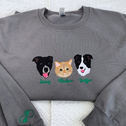 Custom Pet Portrait Hoodies - Varsity Style Dog Cat Face Embroidered Sweatshirts with Names - Premium Pet Lover Gift